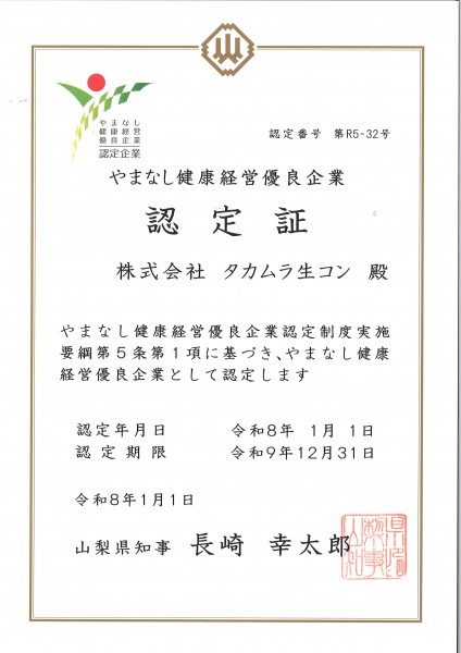 タカムラグループ(タカムラ建設株式会社、株式会社タカムラ生コン、昭和建設株式会社)は、「やまなし健康経営優良企業」の認定を更新しました。